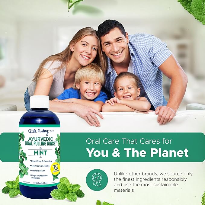 - Ayurvedic Oral Care for a Healthier Smile: Dale Audrey's mouth wash for adults supports stronger teeth and healthy gums. This natural mint-flavored pulling oil for teeth and gums contains ayurvedic ingredients that help freshen your breath, and maintain oral hygiene without harsh chemicals. Keep your gums and teeth strong and healthy with our ayurvedic oil-pulling rinse. Experience a cleaner, more refreshed mouth with every swish of our fluoride free mouthwash.