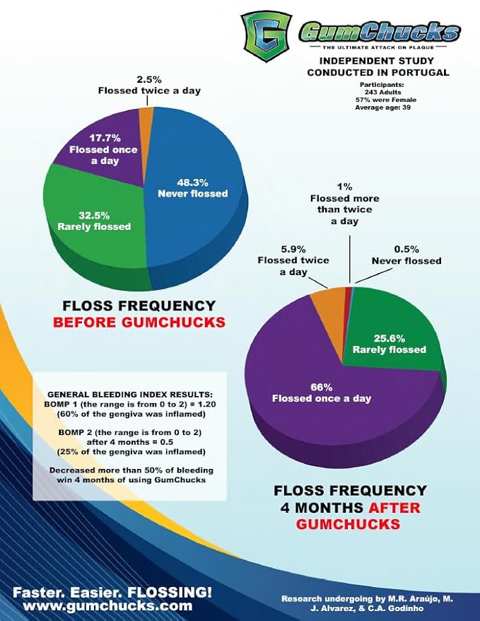 - Floss and Toss - Simply press the button to release the old floss pick. Independent Study demonstrated that GumChucks makes flossing so easy and fast, that 73.7% of people who tried GumChucks became regular daily flossers!