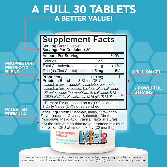 - DENTIST FORMULATED Kids oral probiotics with strawberry-vanilla flavor support oral health, provide cavity protection and effective kids bad breath treatment.