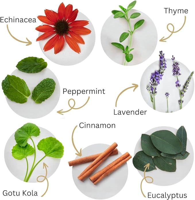 - INGREDIENTS - Deionized water, vegetable glycerine, extracts of echinacea angustifolia, echinacea purpurea, gotu kola, pure essential oils of peppermint, red thyme, cinnamon bark, eucalyptus globulus, lavender, and plant saponins.