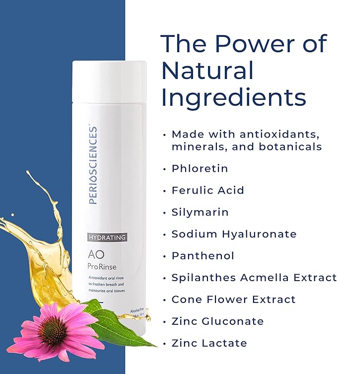 - Natural ingredients - PerioSciences mouthwash alcohol free is made using our signature antioxidants and essential oils such as phloretin, ferulic acid, silymarin, and Spilanthes Acmella extract. The Hydrating rinse contains cone flower extract that helps promote gum health.