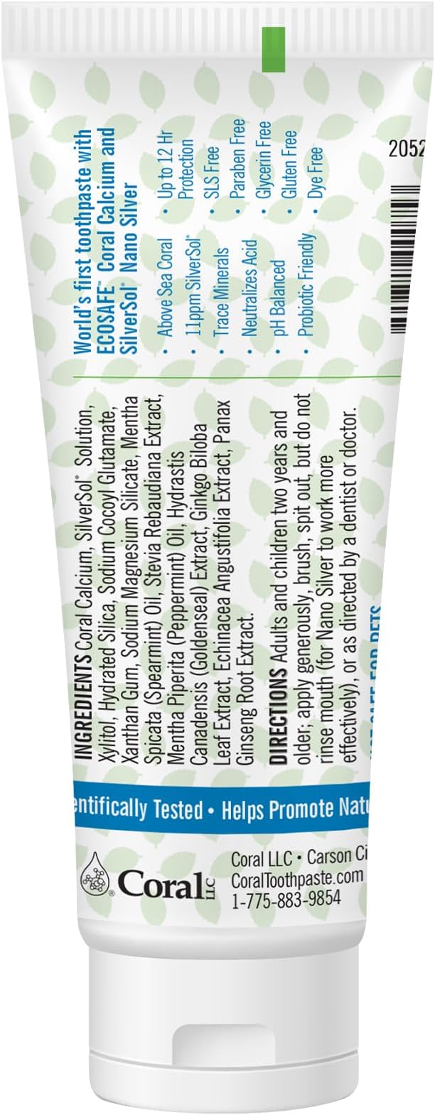 - NANO SILVER TECHNOLOGY: Coral nano silver fluoride free formulated triple action toothpaste formula combines the power of coral calcium, SilverSol nano silver technology, Xylitol, and Therapeutic Grade Peppermint Oil providing up 12 Hours of Protection.