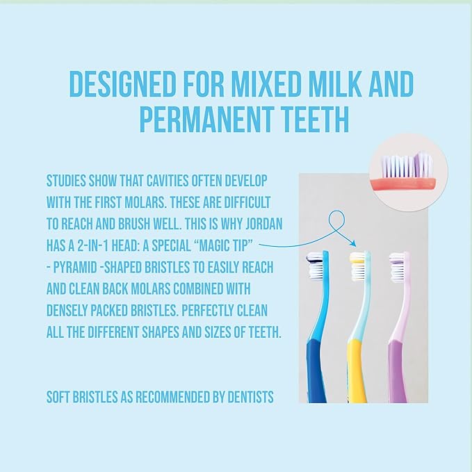 - ⭐ Jordan Step 3 kids toothbrush is tailor-made to brush the mix of milk and permanent teeth that children between the ages of 6 and 9 have.