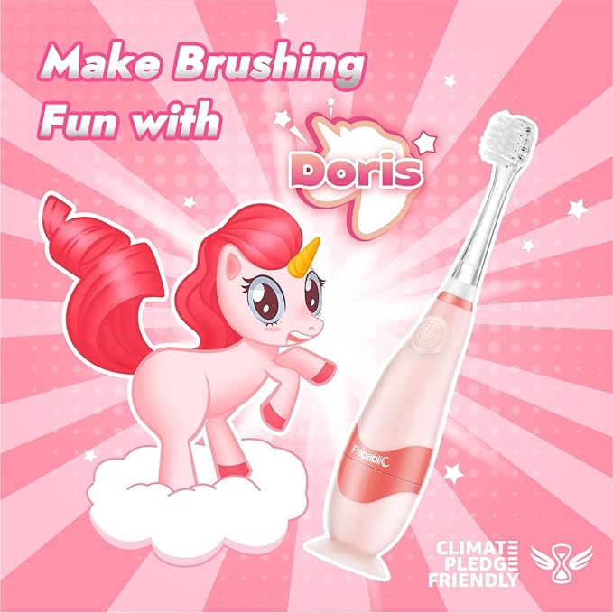 - Make Brushing Fun with Doris: Featuring a cute unicorn design, the innovative toddler toothbrush brings the unique and pure fantasy in children's imagination alive and makes brushing so much fun for your children. The built-in LED light is a magic glow to shed more fun to brushing! Make teeth brushing less of a struggle and turn it into a fun daily activity with mom or dad!