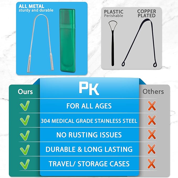 - [Extra-Wide Stainless Steel Scraping Head] - Each tongue cleaner features smooth stainless steel metal for ultimate strength. The extra-wide stainless steel scraping head allows for the metal tongue scrapers to maximize scraping power. Unlike cheap tounge scrappers plastic, these tongue scraper stainless steel will give you the freshest breath time and time again. Use your new tongue scraper every day with swiftness and ease.