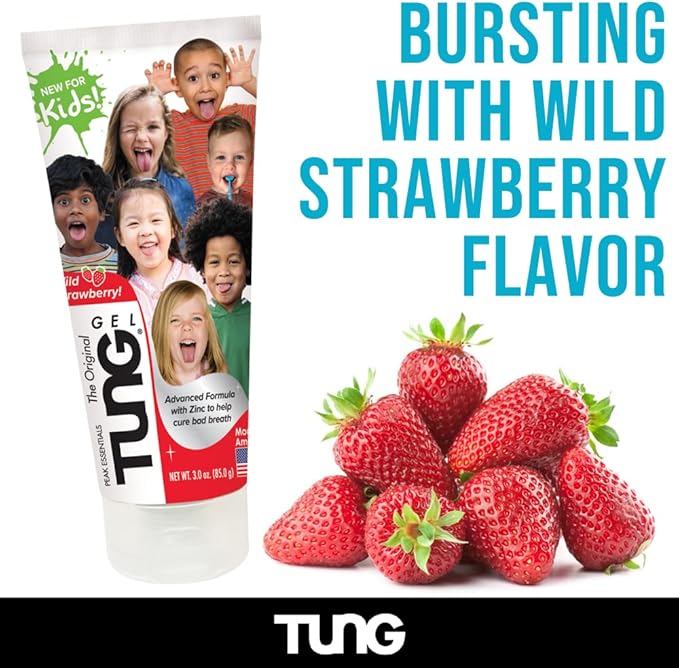 - The Original Kids TUNG Gel With a great tasting wild strawberry flavor, kids will WANT to brush their tongue! Colorful packaging of happy kids with funny expressions is sure to bring a smile and have your child excited to try the gel cleaner; The gel contains Zinc; The gel naturally and safely eliminates bad breath by neutralizing the sulfur gas that comes from the tongue; With the help of TUNG, teach your family that tongue cleaning is an essential part of daily oral care