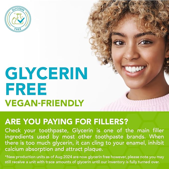 - POTENT INGREDIENTS: Our nano-hydroxyapatite toothpaste is packed with Xylitol for anti-cavity properties, organic aloe for natural healing, sea salt to tighten gums + is gluten, soy, dairy & glycerin free!* This sensitive toothpaste is also free of harsh whiteners, SLS, petroleum or animal products making it a vegan friendly toothpaste. *New production as of Jul 2024 is glycerin free however, please note you may still receive a unit with trace amounts of glycerin until our inventory is fully turned over.