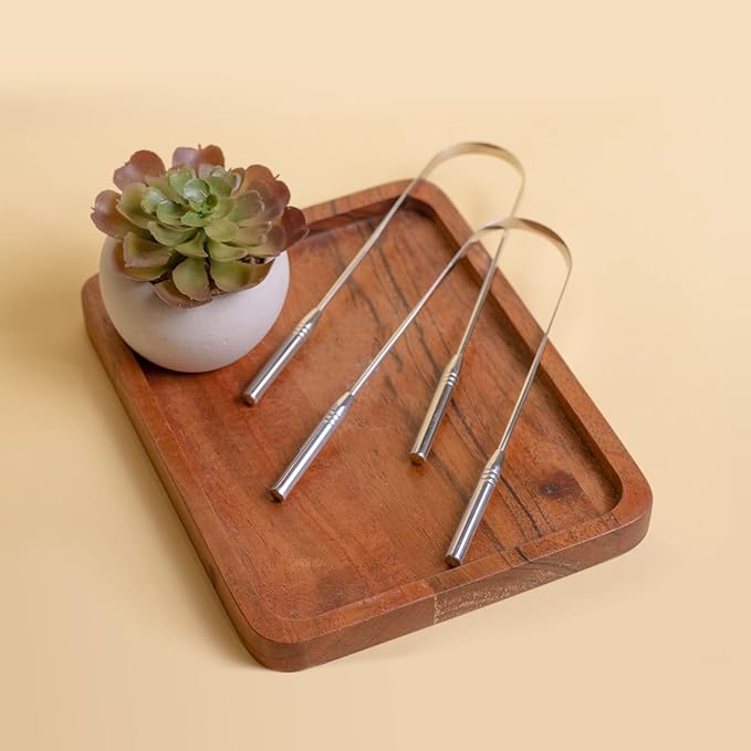 - HOW TO USE: We recommend using our steel tongue scraper after brushing your teeth. Start from the back and scrape your tongue, moving toward the front of the mouth. Rinse with water. Clean and store your silver tongue scraper in your dental hygiene kit.