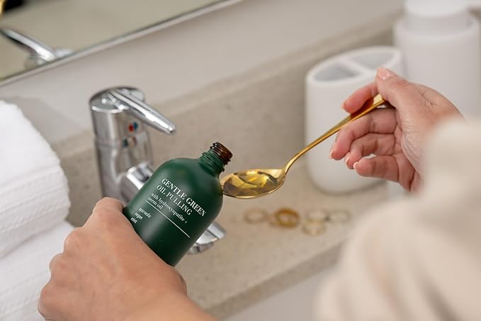 - DESIGN MADE FOR GREENER PLANET: From our ingredients to our packaging, we keep Mother Earth in mind. Gentle Green Oil Pulling uses only a natural blend of oils in an ultraviolet glass bottle to protect ingredients from all visible rays. Our Tongue Scraper is made from 100% medical grade stainless steel and is fully recyclable.
