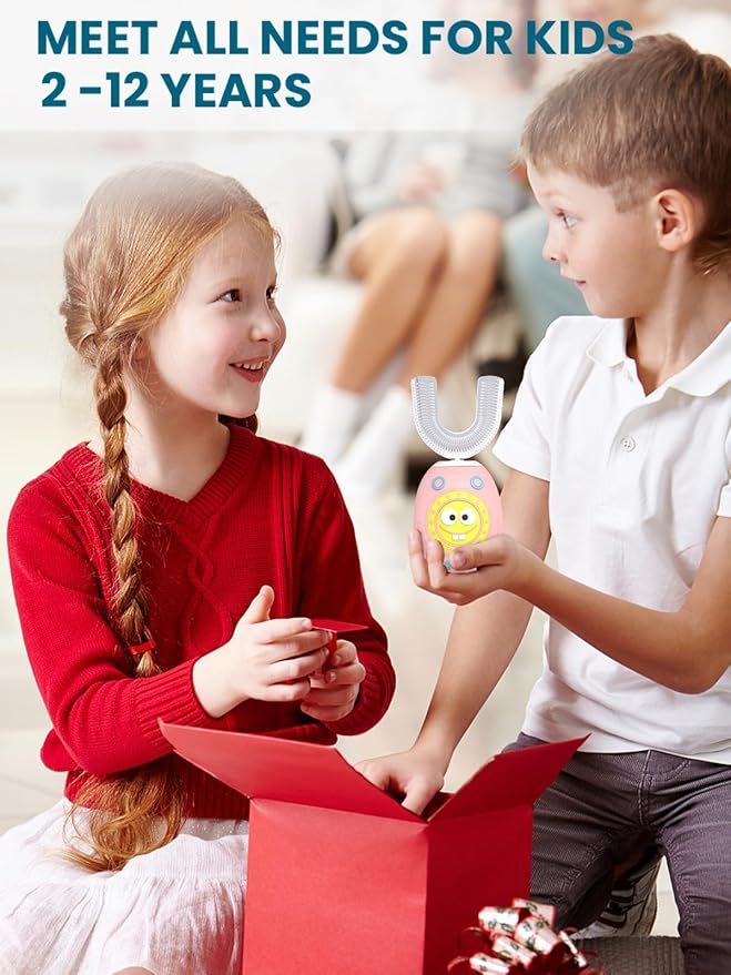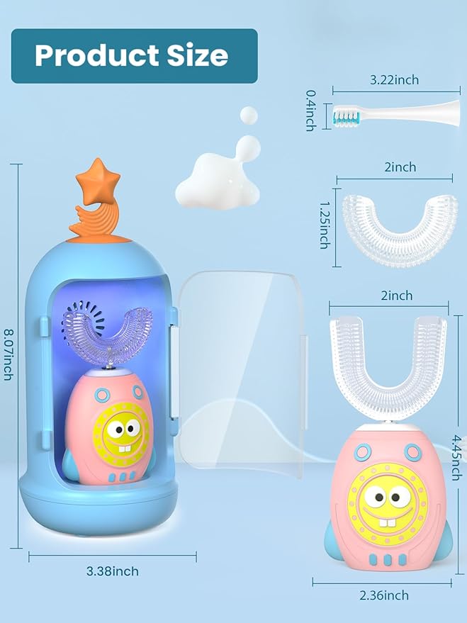 - 🍬【Multifunctional Mode】: Our children's U shaped electric toothbrush has 5 different ultrasonic cleaning modes, you can choose the ultrasonic cleaning mode according to your needs, which is very beneficial to the health of children's gums and teeth. Upgrade model electric toothbrush each brush 45 seconds of scientific timing, parents do not have to face to face to supervise their children brush teeth.