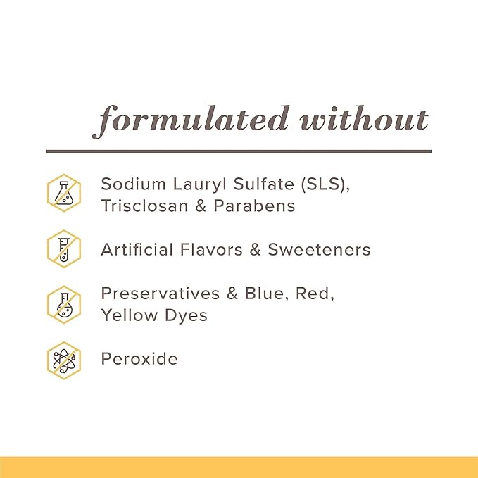 - Made Without: Sodium Lauryl Sulfate (SLS), Triclosan & Parabens, Artificial Flavors & Sweeteners, Preservatives & Blue, Red, Yellow Dyes, Plastic Microbeads