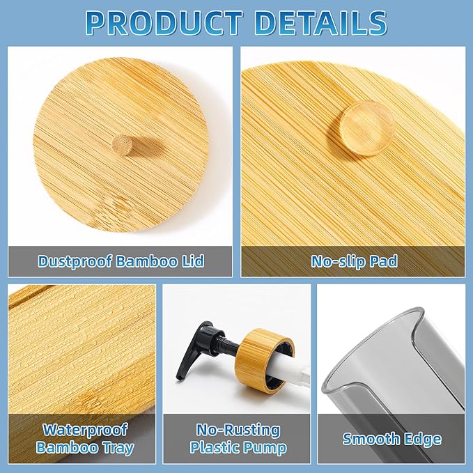 - 【Natural Waterproof Material】The tray, the connection of the pump head, and lid are all from natural material which is recyclable. The surface is covered with a waterproof coating to protect it for long-term use.