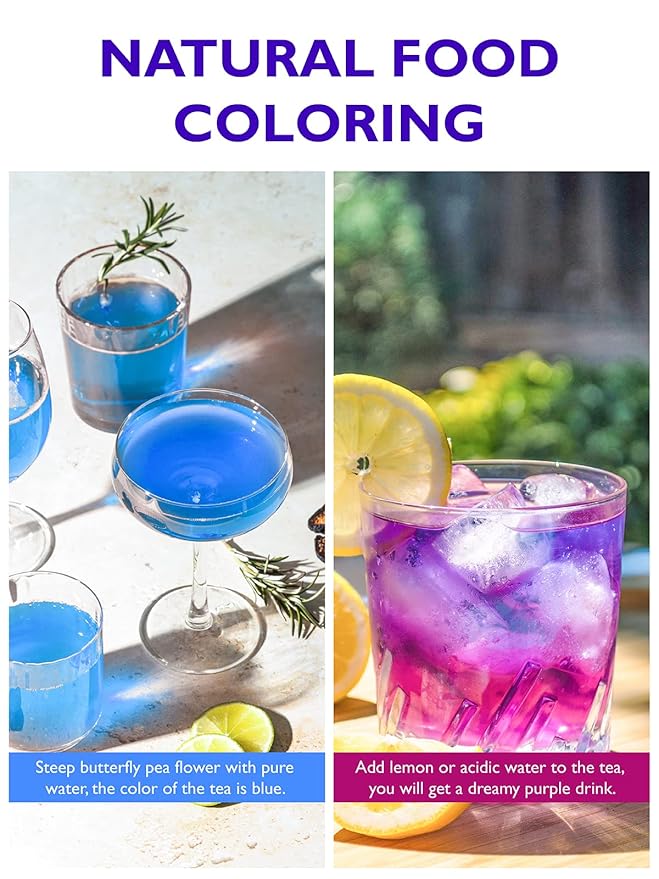 - 【CREATE DREAMY BLUE & PURPLE FOOD】- Mix with acidic water to get purple color, mix with alkaline water to get a blue color. Butterfly pea tea is widely used as an all-natural food coloring that can be added to your favorite drinks, cocktail, foods, dessert, or anything baked and impress your guests at special events!