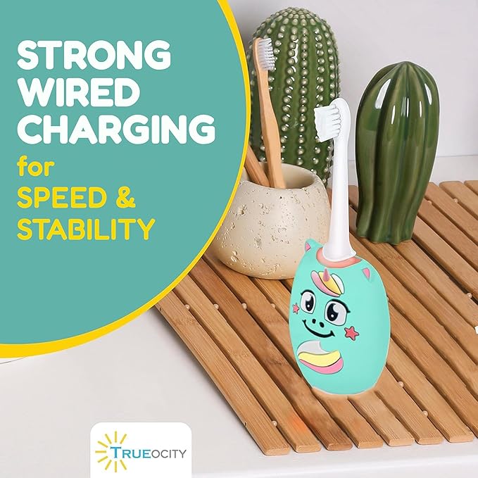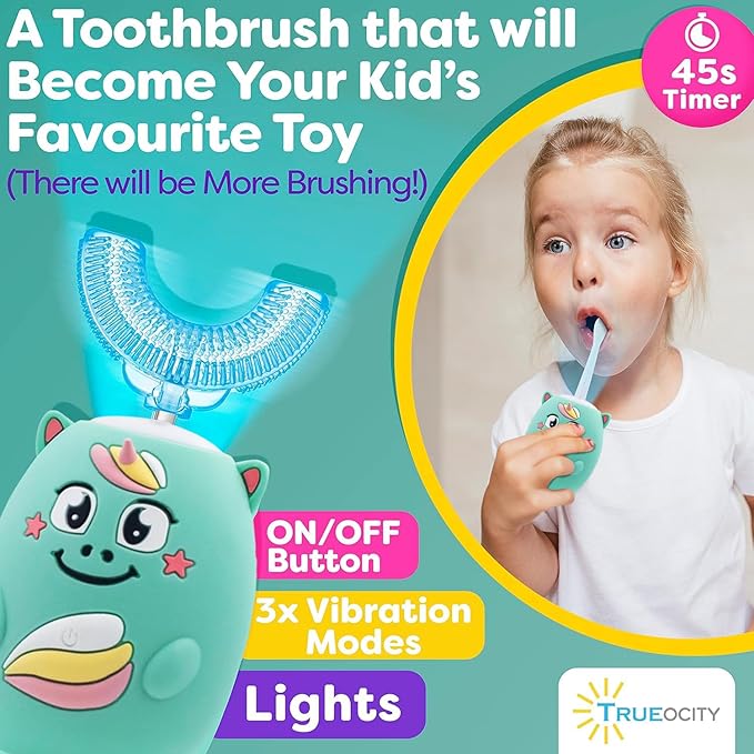 Trueocity Kids U Shape Toothbrush Auto Electric Toddler Rechargeable Kids Automatic Toothbrush | 360° U-Shaped Silicone Brush Head | Gentle Cleaning for Ages 2–7 2–7 | Unicorn Design (Turquoise)