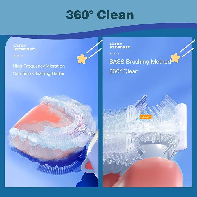 - IPX7 WATERPROOF & 14 Days RECHARGEABLE BATTERY:The kids u shape toothbrushes are designed with IPX7 waterproof seal, the body is washable and easier to clean. The package comes with a USB charging cable, the LED lights up when charging, and it lasts up to 360 hours with 3 hours charge, making it quick and easy to use at home or travel.