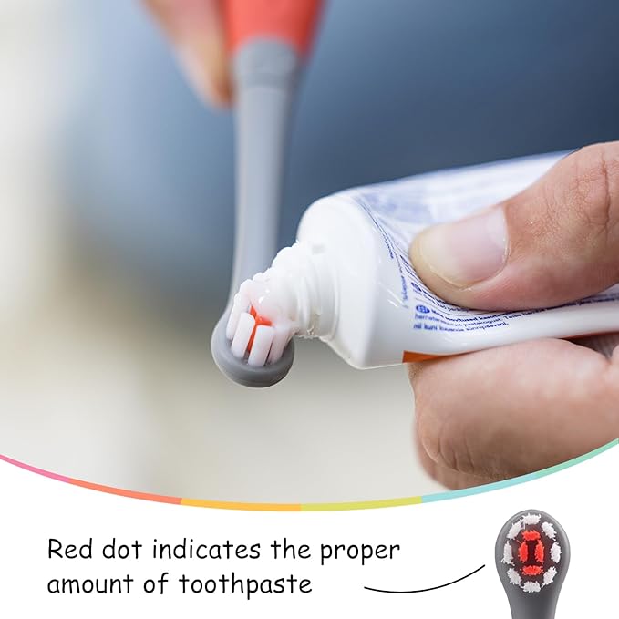 - SOFT RED DOT BRISTLE TODDLER TOOTHBRUSH. Soft bristles clean toddler’s front and back teeth gently. Curved and small size design of the head fits babies' mouth. The red dot on the bristles surface indicates the proper amount of toothpaste, helps to build the skills of independent brushing.