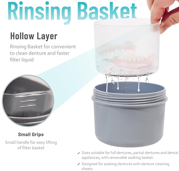- Large Enough to Clean and Soak Your Full Dentures: 3.8'' x4.09'' x 3.07'' high, rinse basket is 3.4'' x 3.4'' x 2.5'', suitable for partial or full dentures with plenty of soaking space. Not only can it clean and preserve your dentures, you can also use this retainer cleaning case to clean and preserve your retainers, wire retainers, mouth guards, night guards, braces and orthodontic appliances, etc., and it can even be used as a small organizer for travelers.
