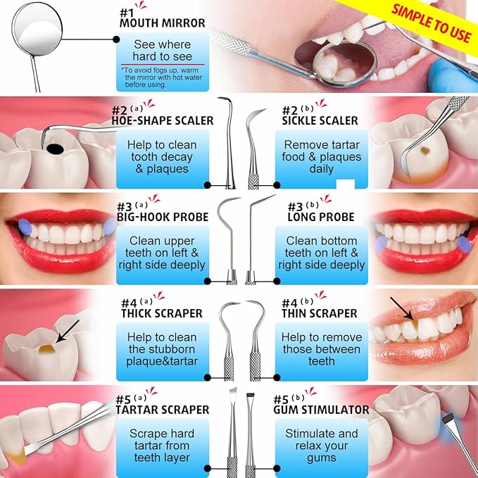 - Easy Daily Care: Comes with quick step instructions for proper use. Anti-slip handle for comfortable grip and precise control, mouth mirror and angled tips for cleaning hard to reach area with confidence. Ideal for regular check for adults, kids, and pet dogs
