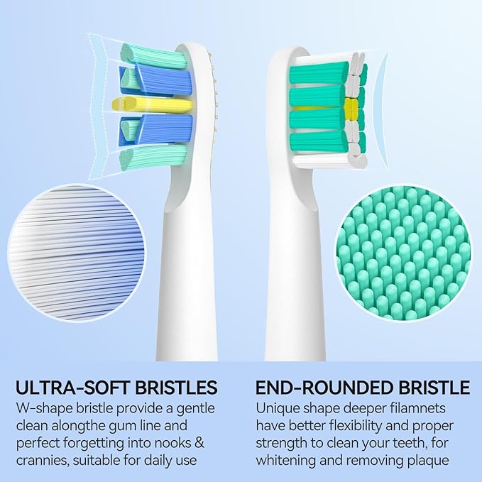 - 10 Replacement Brush Heads: The ultrasonic toothbrush with 2 types of brush heads,6 pcs W-shape bristles that fit your teeth,4 pcs 3D high-density bristles brush heads for deep cleaning