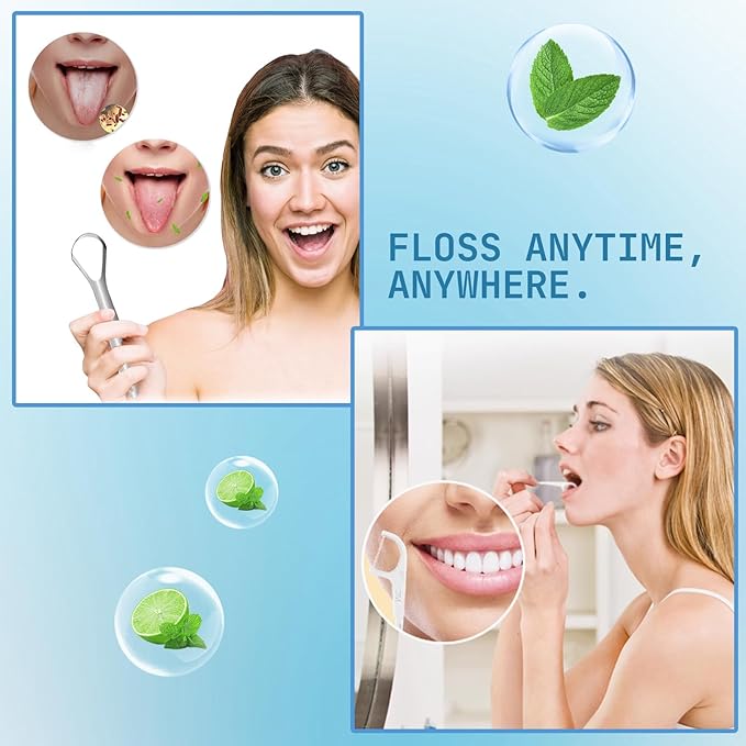 - Small; Portable; 2-pack tongue scraper cleaner with 10 pcs floss picks; You can keep one at home and one in your travel bag convenient for you to manage oral health at any time; The tongue scraper can be cleaned with water or lemonade