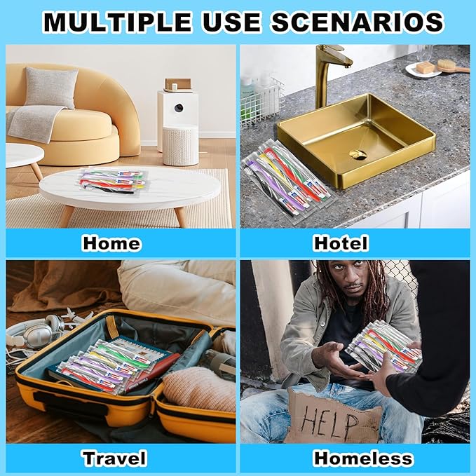 - MULTIPLE USE SCENARIOS:Office toothbrush kits are individually packed so they don't take up too much space. Applicable to hotels, guest travel, aviation, home, bathroom and other places, also applicable to the homeless, hotels, women's shelters, homeless care kits,etc