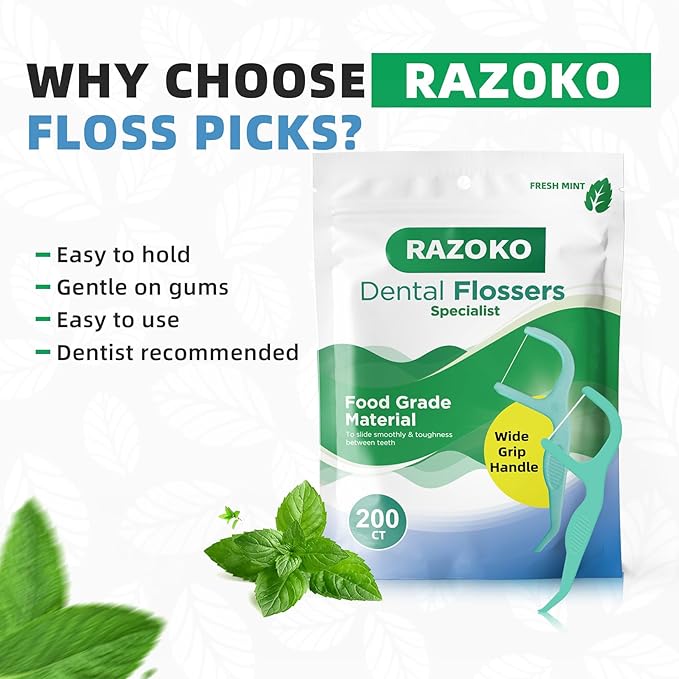 RAZOKO Dental Floss Picks | Toothpick, Shred-Resistant Floss, Easy Grip Handle, Fresh Mint Flavor, 400 Count (Pack of 2)