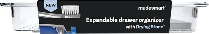 madesmart Expandable Dental Tray Drawer Organizer with Drying Stone, Clear Plastic Organizer for Toothbrush, Dental Floss, Water Flosser, Mouthwash