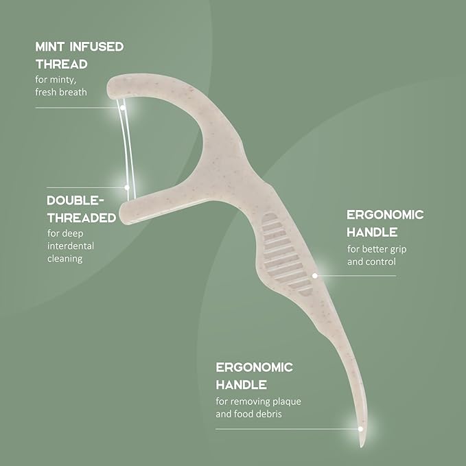 Plant Based Dental Floss Picks (300 Count) - Freshlock EcoPouch, Plant Based, Vegan, Eco Friendly, Sustainable Dental Flossers - Twin Floss (Mint)