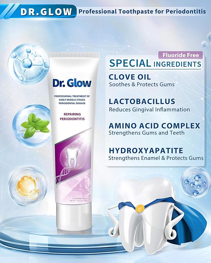 - 1. Gingivitis and Periodontal Disease Treatment: Dr. Glow gum repair toothpaste contains effective ingredients targeting gingivitis and early-mid periodontal disease discomfort; penetrates deep into gum tissues to reduce swelling, sensitivity, bleeding, and receding gums; repairs and regrows gum tissue; promotes long-term gum health; helps prevent the return of gum disease