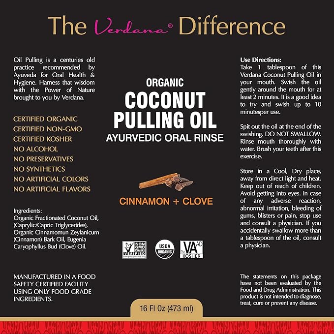 Verdana Organic Oil Pulling Mouthwash – 16 oz Cinnamon & Clove – USDA Organic Coconut Oil Rinse for Teeth & Gums – Alcohol-Free, Fluoride-Free Natural Mouthwash for Fresh Breath & Gum Health