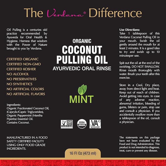 Verdana Organic Oil Pulling Mouthwash – 16 oz Mint – USDA Organic Coconut Oil Rinse for Teeth & Gums – Alcohol-Free, Fluoride-Free Natural Mouthwash for Fresh Breath & Gum Health