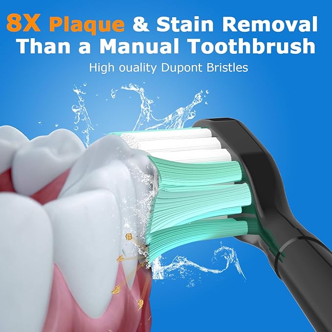 - ăContoured Design for Deep CleaningăThe special designed top bristles on our electric toothbrush heads for can both fit the teeth shape for plaque removal and plaque control, effectively clean hard-to-reach teeth area for better oral care and oral health on your electric toothbrush