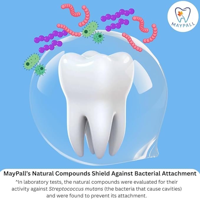 - PREVENTS BACTERIAL ATTACHMENT TO TEETH- Through academic research, MayPall has developed a mouthwash that utilizes naturally derived compounds from maple and green tea extracts. These compounds have been shown to help prevent bacterial attachment to surfaces, offering a natural solution. MayPall also includes xylitol (derived from birch trees) which has been clinically shown to help reduce the growth of bacteria that contibute to tooth decay.