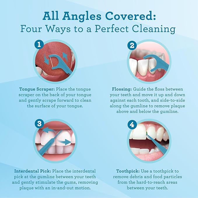 - Cleans Better & Deeper: Effortlessly glide the floss between teeth, help reduce bad breath with the tongue scraper, remove food particles & plaque with the interdental pick, & reach tricky spots with the toothpick.