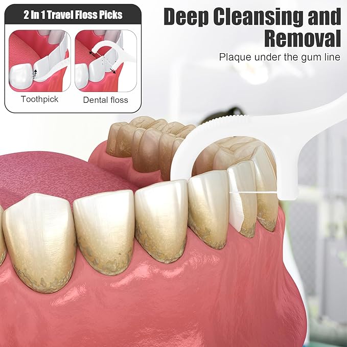 - 2-in-1 Function: These flossers are designed with 2-in-1 functions, the tooth floss picks can remove food debris between teeth and improve the oral environment; with a sharp tip, it can be used as a toothpick for deep cleaning to avoid tooth decay and other dental diseases, allowing you to show your smile confidently.