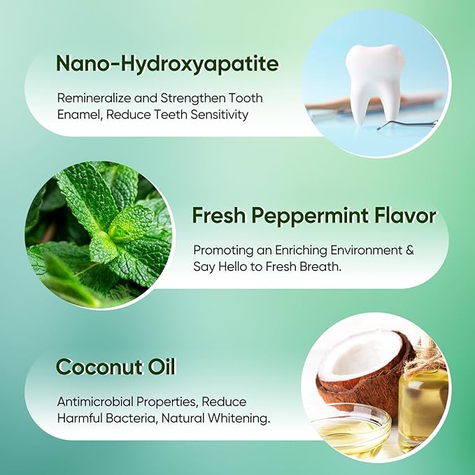- NANO HYDROXYAPATITE: Helps to remineralize and strengthen tooth enamel, making it beneficial for people with sensitive teeth. Nano hydroxyapatite can effectively fill in microscopic enamel imperfections and provide protection against tooth decay.