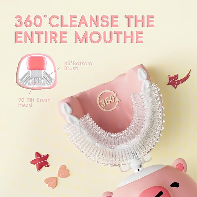 - 【Whole Mouth 360° Clean】Auto toddler toothbrush with 45° tilt brush head and 90° bottom brush would clean your child's teeth 360° in all directions, without missing any small deciduous teeth, effectively removing plaque.