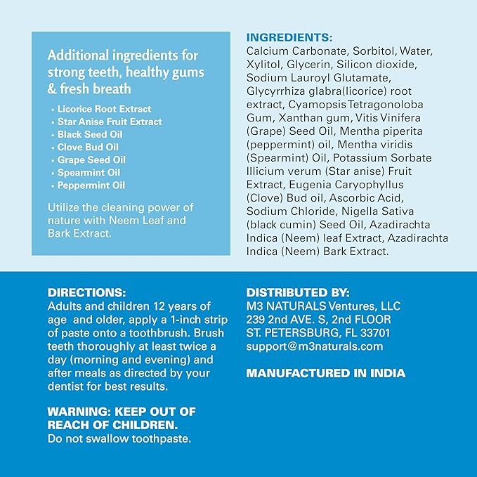 - No more plaque with neem: M3's flouride free neem toothpaste targets surface stains on your teeth that may have latched on from different food and drinks you consume on a daily basis. Best used twice a day and after meals, or as recommended by your dentist.