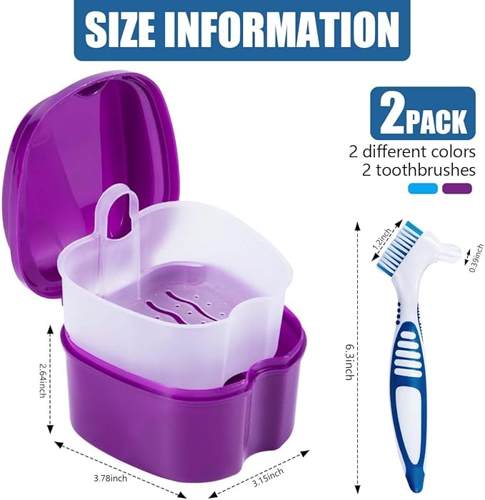 - Packaging Includes: 2 Pack False Tooth Case and 2 Pack denture brush. small size (3.78 x 3.78 x 2.68 inch) easy to carry, allowed for home, office, car, travel, camping.