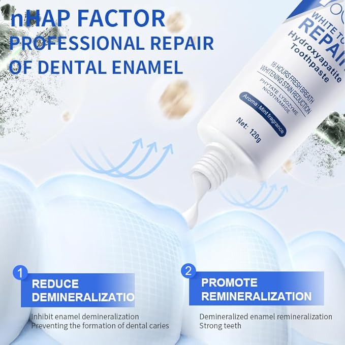 - Hydroxyapatite toothpaste, gentle yet effective to restore and strengthen tooth enamel, protecting your teeth from daily wear and tear.