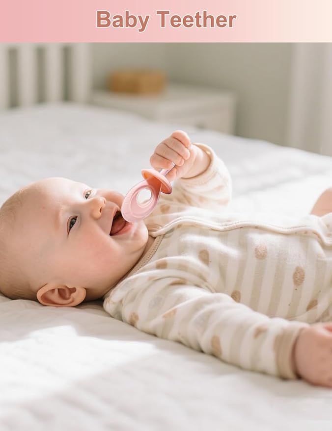 Baby Toothbrush & Teether for Infant and Toddler, Silicone Baby Oral and Tongue Cleaner, Ultra Soft Infant Training Toothbrush with Travel Case, Adjustable Safety Shield - Pink