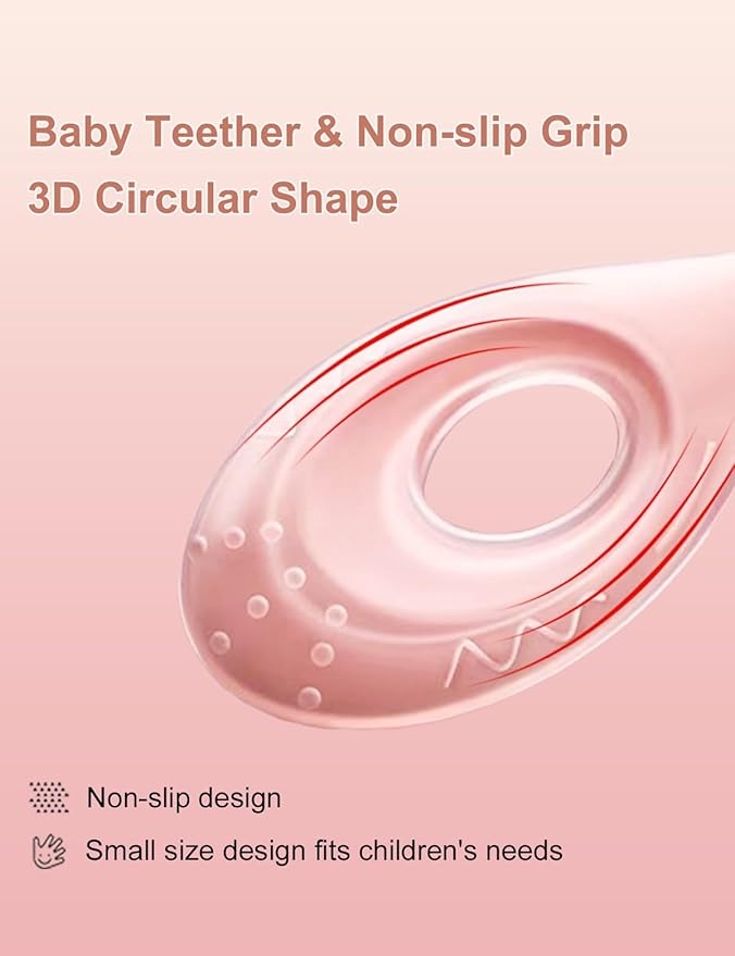 - 【NON-SLIP GRIP】The baby toothbrush is designed with a non-slip grip, even with toothpaste foam all over hands. The handle is also a baby teething relief, helping soothes teething gums.