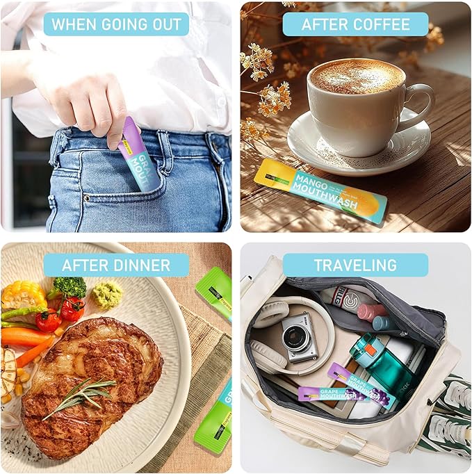 - Easy to Use: First tear open the mouthwash package and pour the mouthwash for 60 seconds, then spit it out without rinsing your mouth with water, very easy to use