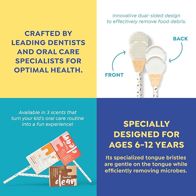 SuperMouth® Double Scoop Kids Tongue Scraper – Dual-Sided Brush & Scraper Removes Odor-Causing Buildup, Fights Bad Breath, Easy-Grip Ice Cream Design, 3 Yummy Scents, Ages 6-12, Essential Oral Care