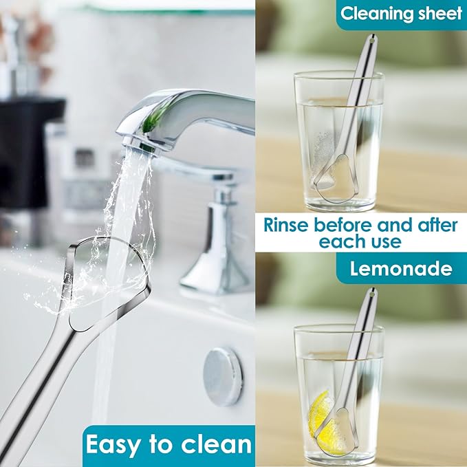 - [Double sided Design] We use odorless stainless steel, which has no metallic taste and will not cause nausea (if you have slight nausea when cleaning the base of your tongue, please extend your tongue as long as possible). When you use it for the first time, the tongue coating is sensitive.