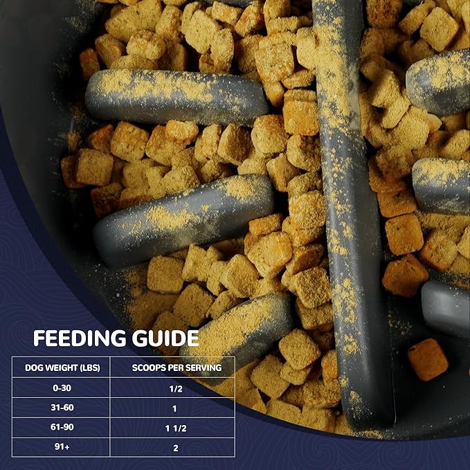 - Easy Daily Routine: Simply add to food or serve directly. Pre-measured scoop included (1 scoop=5g).Just use 1/2 scoop for small dogs (<30lbs), 1 scoop for medium (35-60lbs), 1 1/2 scoops for large (61-90lbs),or 2 scoops for extra large breeds (>90lbs).