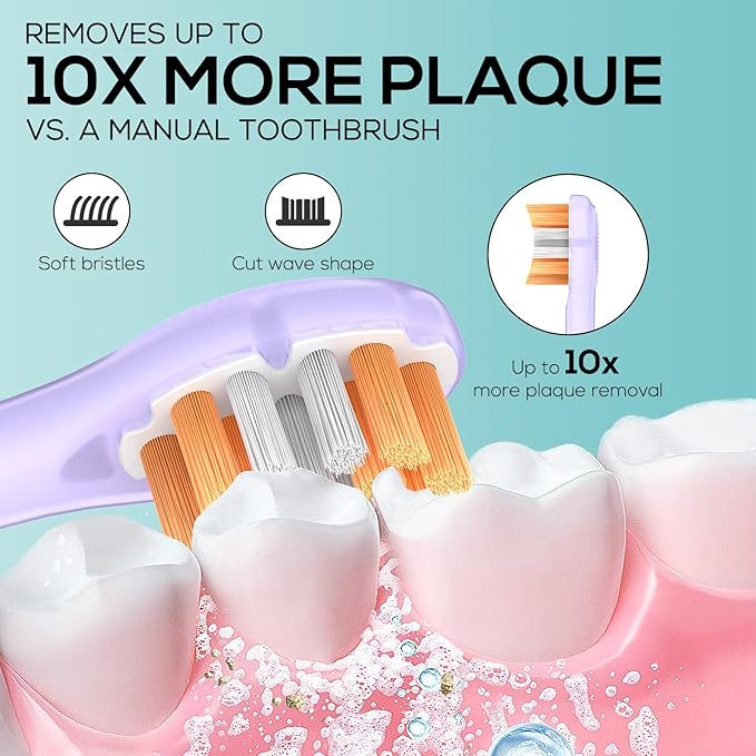 - WAVE-SHAPED BRISTLE DESIGN FOR OPTIMAL FIT: Waveform design dense bristles cover hard-to-reach areas for enhanced sonic cleaning for deeper cleaning. Compared to manual toothbrushes, it is easier to remove stubborn tooth stains and effectively improve the overall health of the gums.