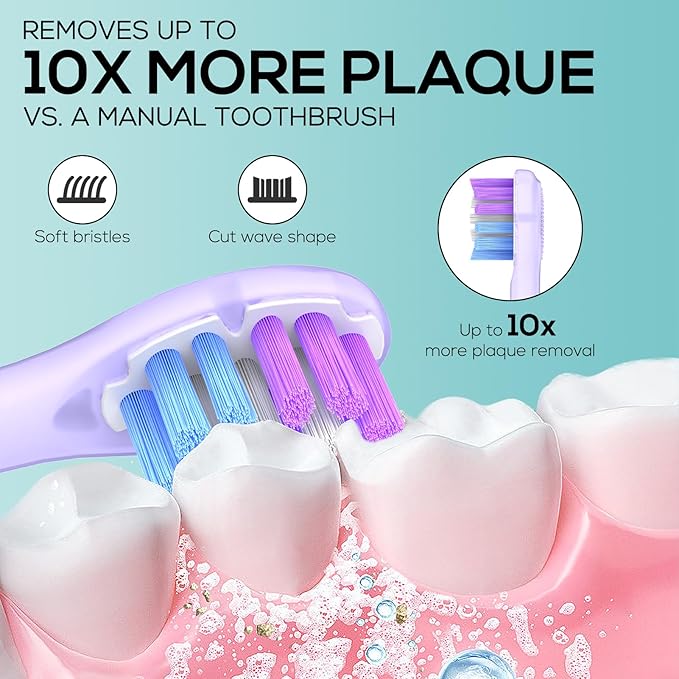 - WAVE-SHAPED BRISTLE DESIGN FOR OPTIMAL FIT: Waveform design dense bristles cover hard-to-reach areas for enhanced sonic cleaning for deeper cleaning. Compared to manual toothbrushes, it is easier to remove stubborn tooth stains and effectively improve the overall health of the gums.