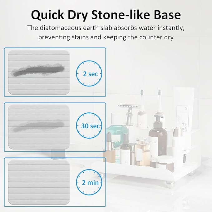 - Quick Dry: Toothbrush holder features a removable, super-absorbent diatomaceous earth slab that sucks water away instantly