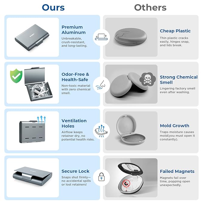 - High-Quality Material: Made of durable aluminum alloy, Oralphi retainer case is naturally non-toxic, odorless, and rustproof. Unlike ordinary fragile plastic denture case that leach chemicals and develop foul smells, our metal construction withstands crushing forces and will not crack after long-term use, protecting your orthodontic accessories or retainers stay pristine and safe. Experience lasting hygiene and peace of mind—no more chemical tastes or worrying about degradation over time.